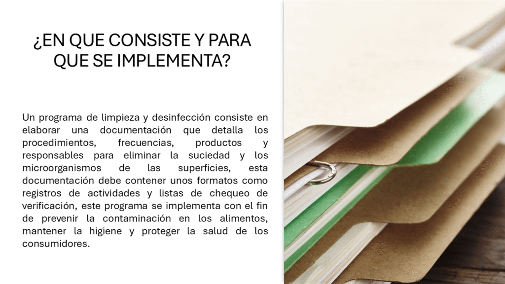 ¿Qué es un programa de limpieza y desinfección? un programa de limpieza y desinfección es un programa que comprende la descripción de los procedimientos de limpieza y desinfección que se llevan a cabo en un determinado establecimiento, este programa hace parte junto con el programa de control de plagas, el programa de residuos solidos y el programa de abastecimiento de agua, del plan de saneamiento que todo establecimiento debe ejecutar y demostrar ante la autoridad sanitaria.