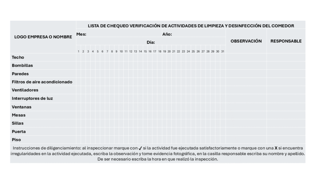 FORMATO DE LISTA DE CHEQUEO DE VERIFICACIÓN DE ACTIVIDADES DE LIMPIEZA Y DESINFECCIÓN DEL ÁREA DE COMEDOR DE UN RESTAURANTE